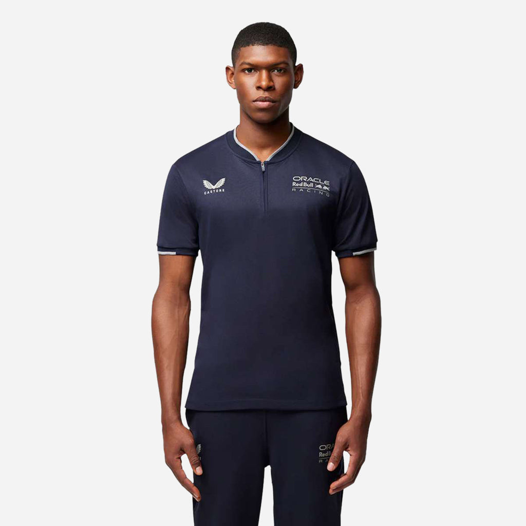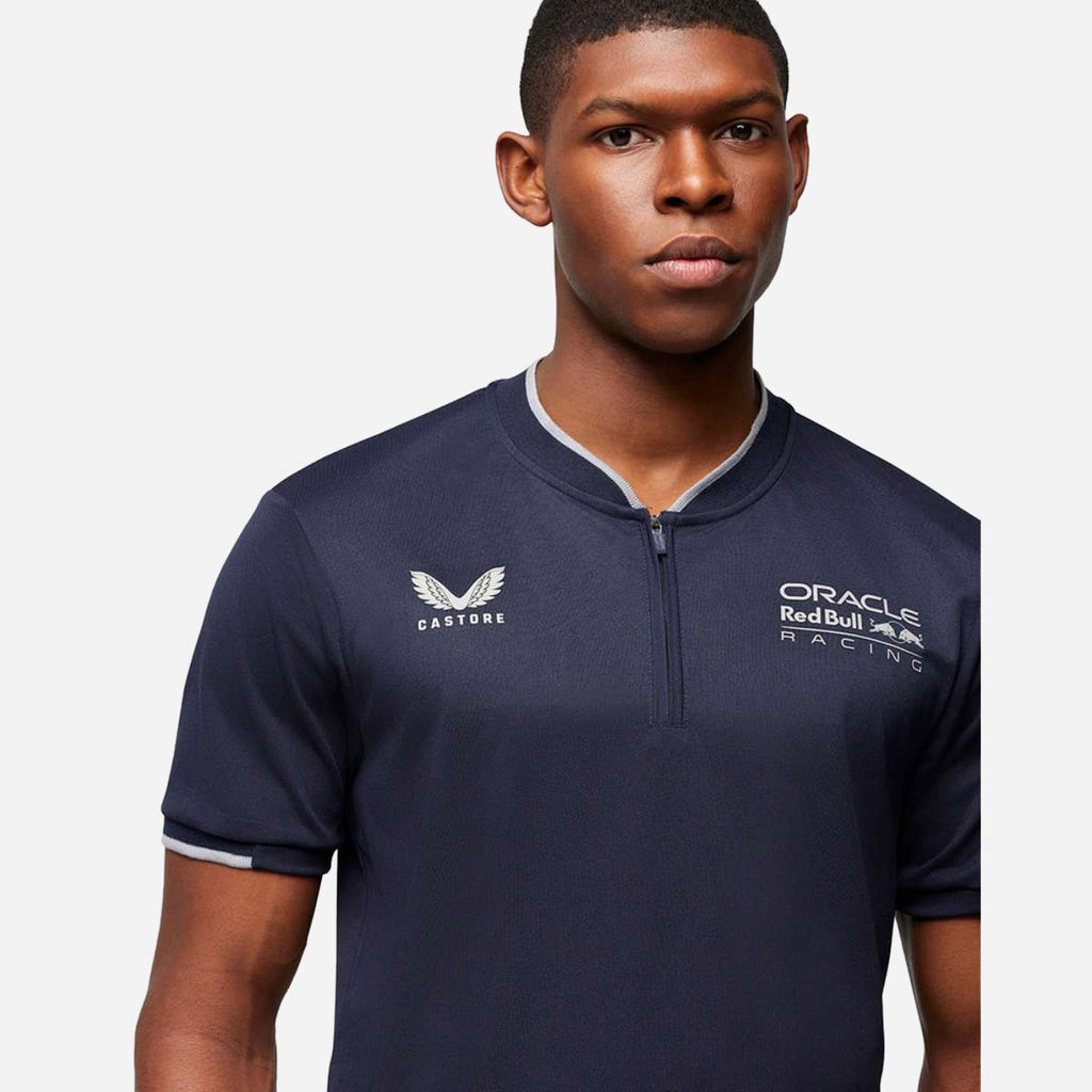 Hit the track in style with the Lifestyle Polo Shirt from the Oracle Red Bull Racing Dual Brand Lifestyle collection. The design features contrasting details on the rib collar, as well as a half rib collar and Oracle Red Bull Racing logos. You can adjust the front zipper to cool down - or let another layer zien.